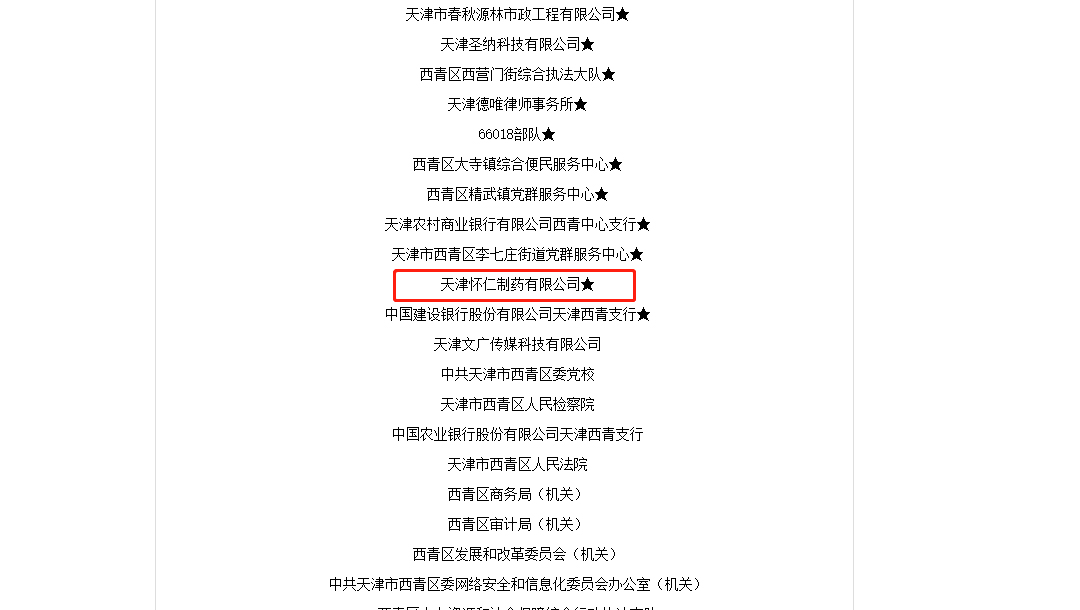 近日,天津市西青區精神文明建設委員會辦公室公示了2021-2023年度天津市西青區文明單位,天津懷仁制藥有限公司榮獲天津市西青區“文明單位”稱號!